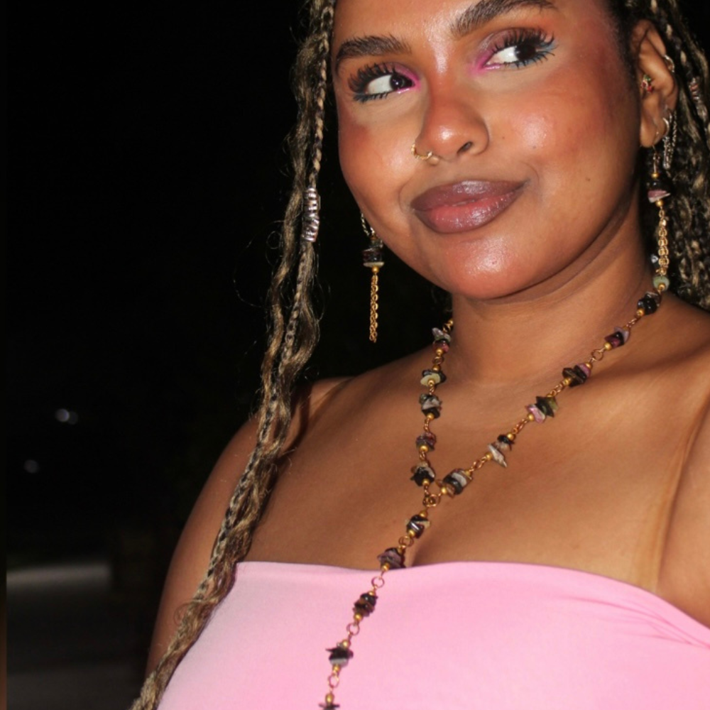 A long necklace made of natural chip stones, featuring organic irregular details that reflect the raw beauty of nature, paired with matching earrings for a simple yet elegant look.