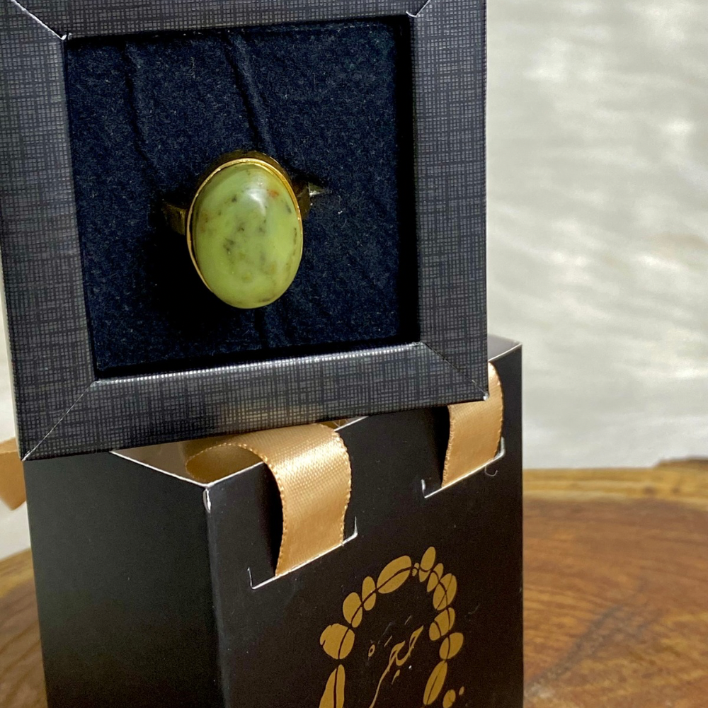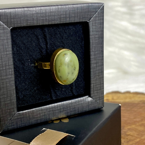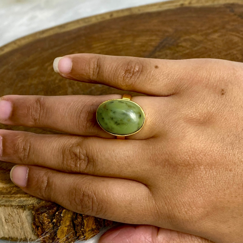 A Green Jade stone ring featuring its distinctive color and soft natural shine. Designed with simple details that highlight the beauty of the stone. Made of gold-plated brass, adding an elegant and luxurious touch, perfect for everyday wear.