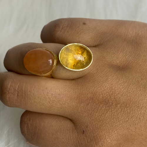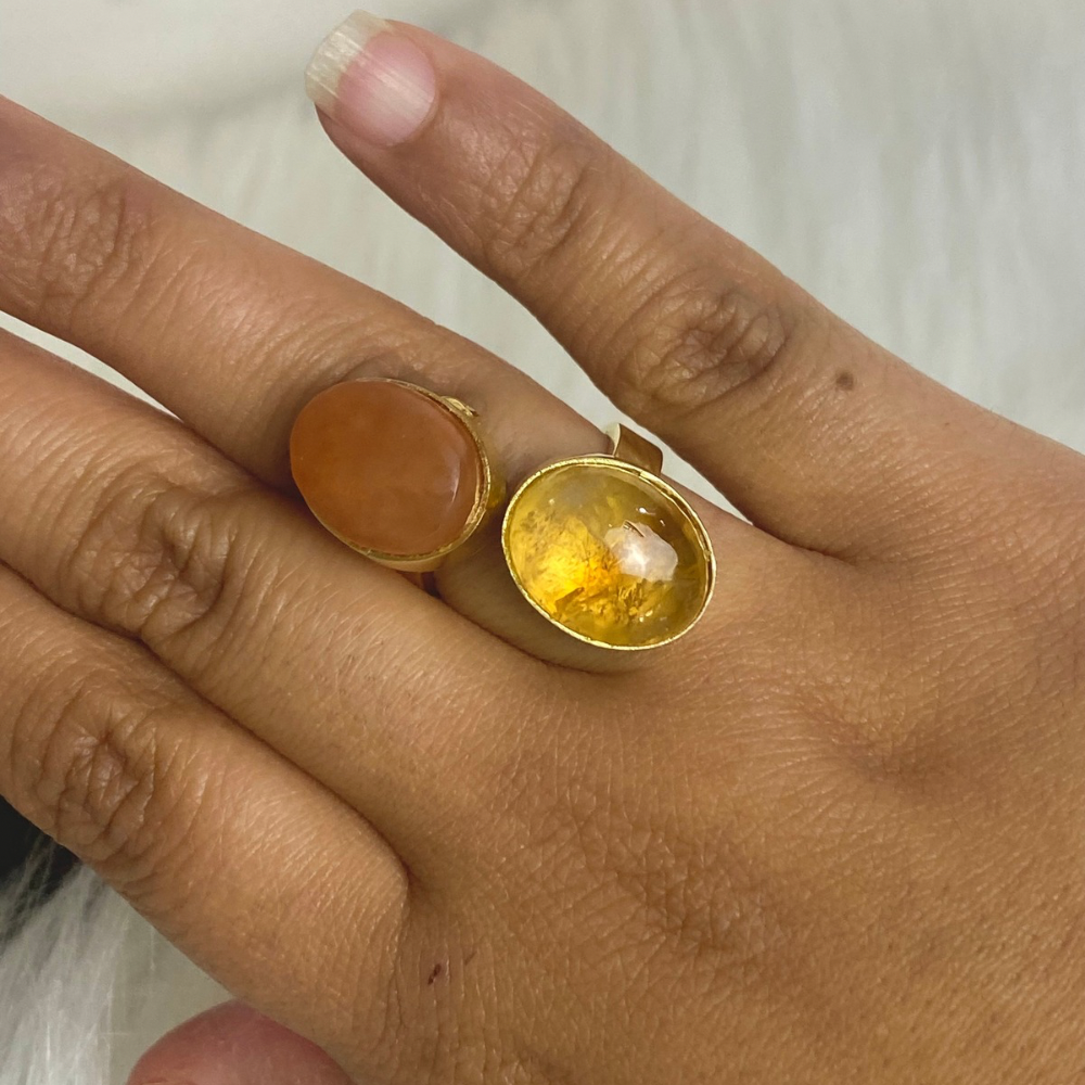 An elegant ring featuring Citrine and Carnelian Agate with their warm, vibrant colors. Citrine is associated with positivity and attracting opportunities, while Carnelian is known for its energizing and confidence-boosting qualities. Together, they create a beautiful balance of uplifting energy and style