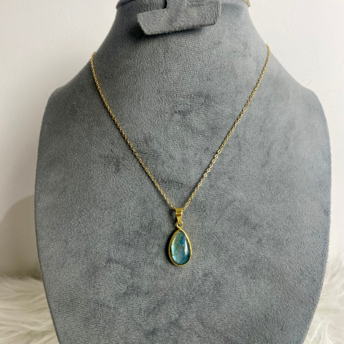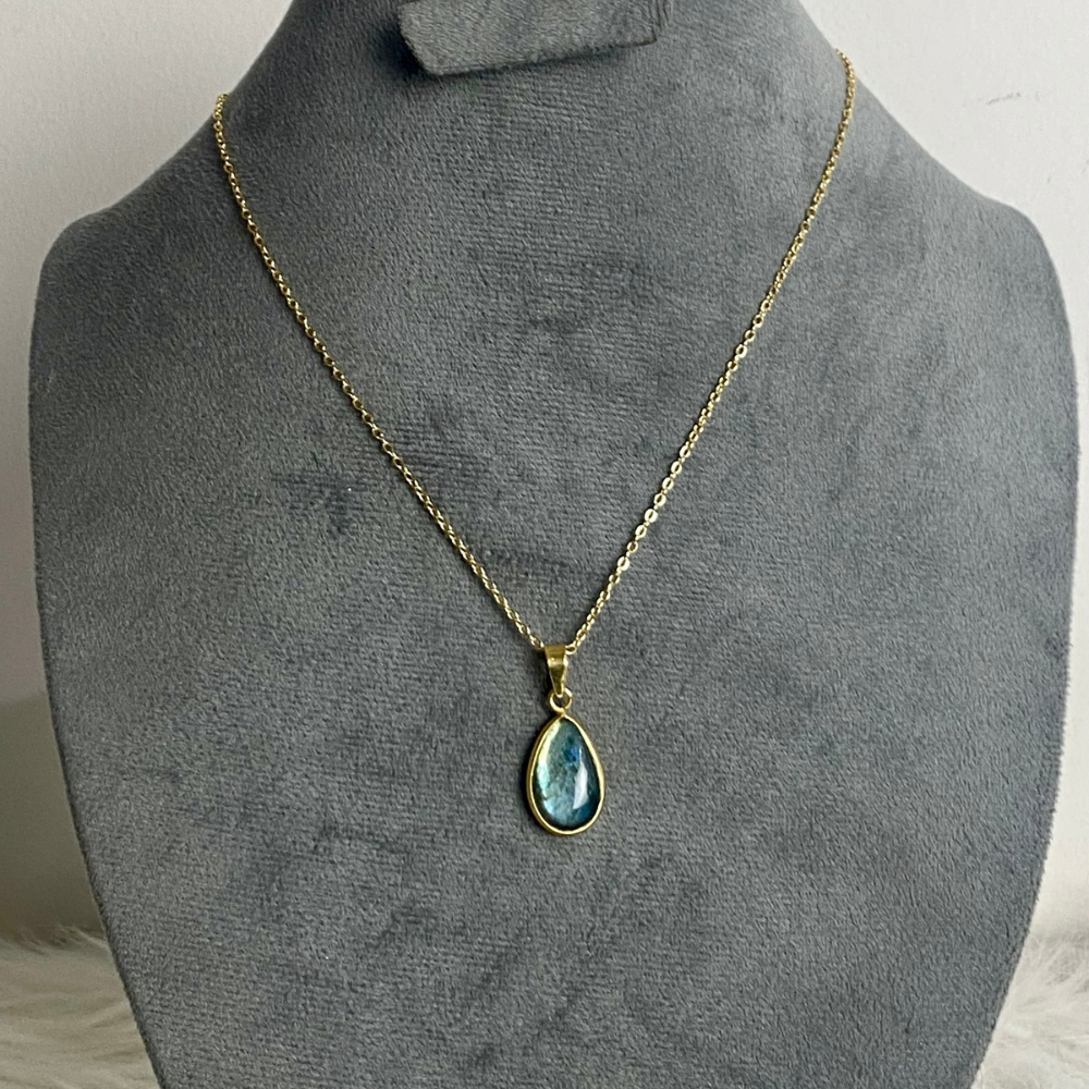 A necklace featuring a natural Labradorite stone, known for its unique shine and beautiful flashes that appear in the light. The simple design highlights the beauty of the stone and adds an elegant touch to any look. The frame is made of gold-plated brass, giving the piece a luxurious appearance while remaining lightweight and comfortable for everyday wear.