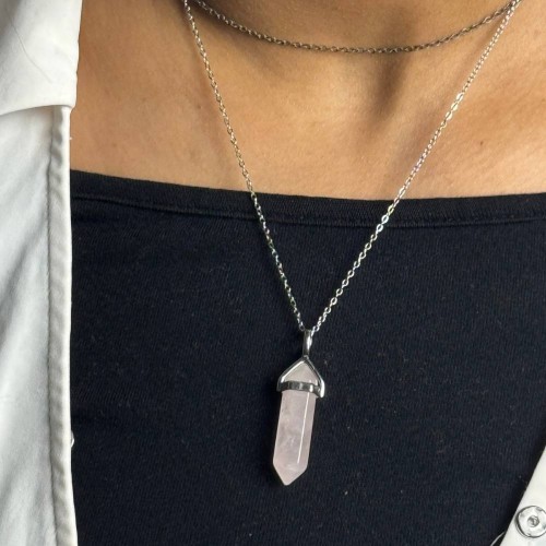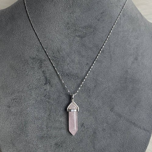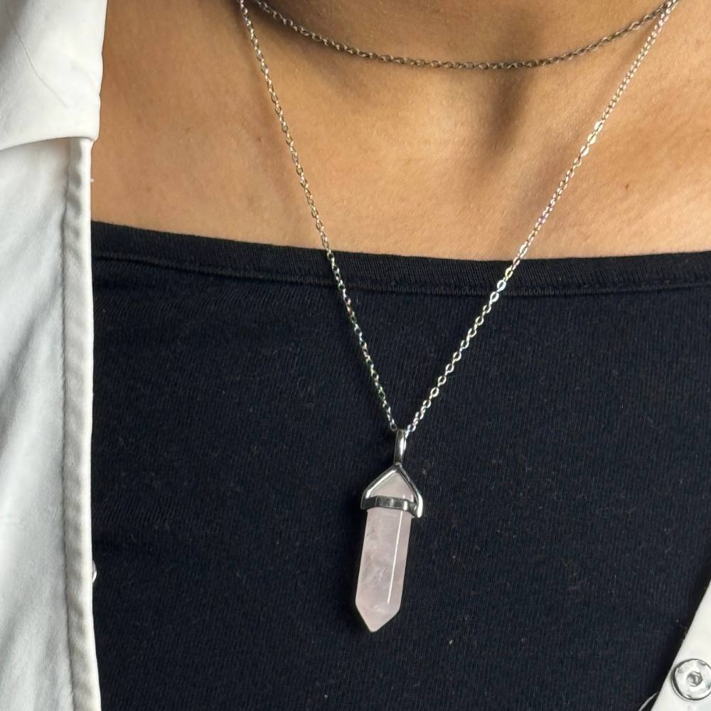 Elegant necklace featuring Rose Quartz with a rust-resistant stainless steel chain. Rose Quartz is known for promoting love and calmness.