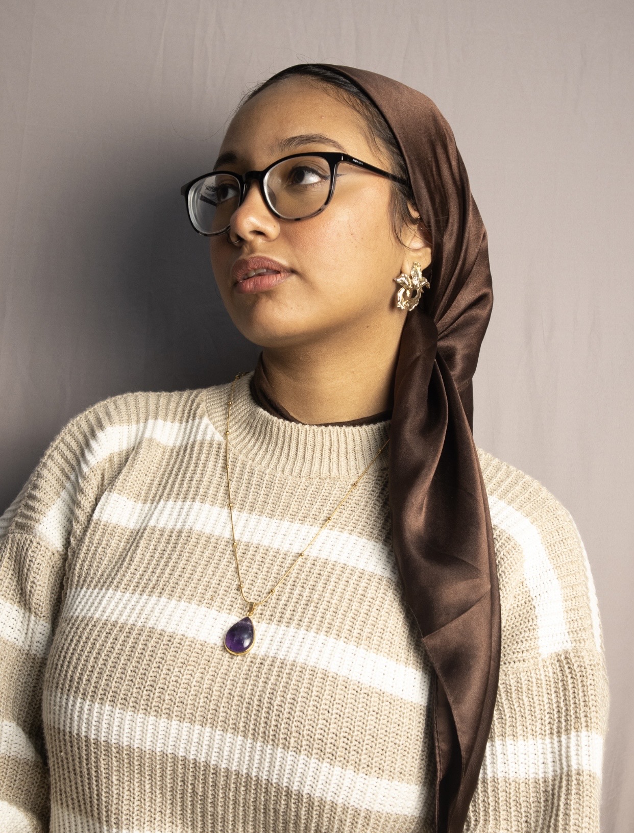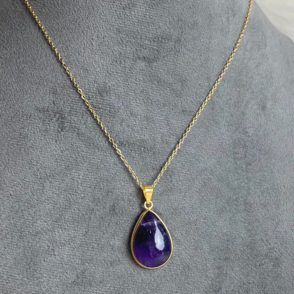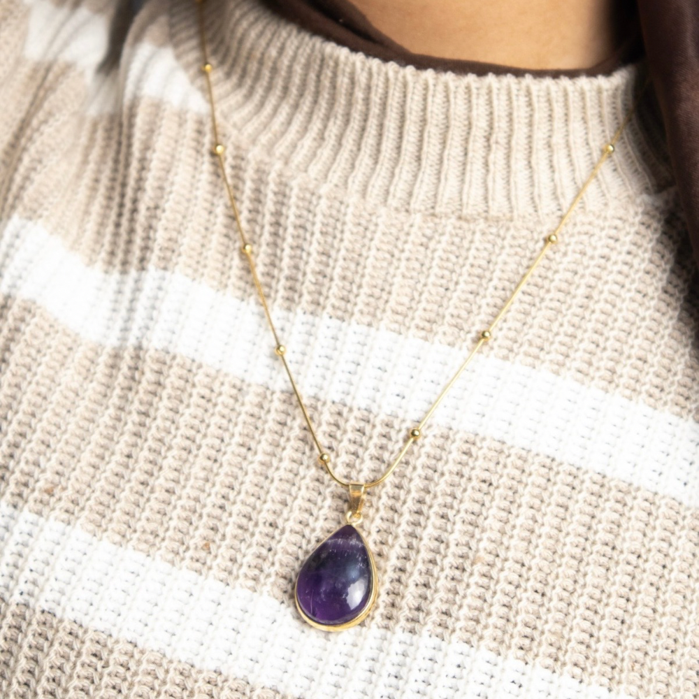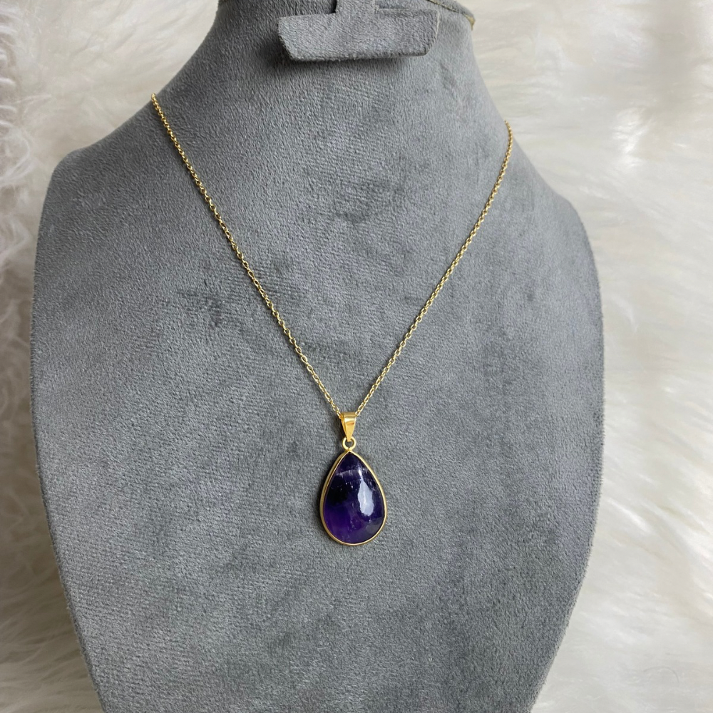 A natural amethyst necklace with a calming purple tone that brings a sense of balance and relaxation. The frame is gold or silver plated brass, paired with a stainless steel chain that is rust-resistant and perfect for everyday wear, finished with a simple and elegant design