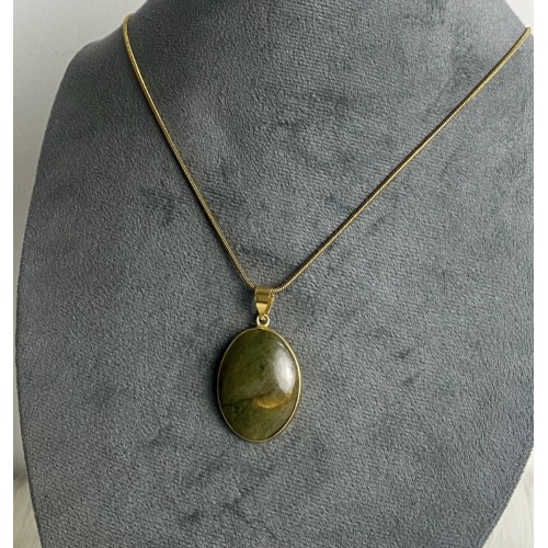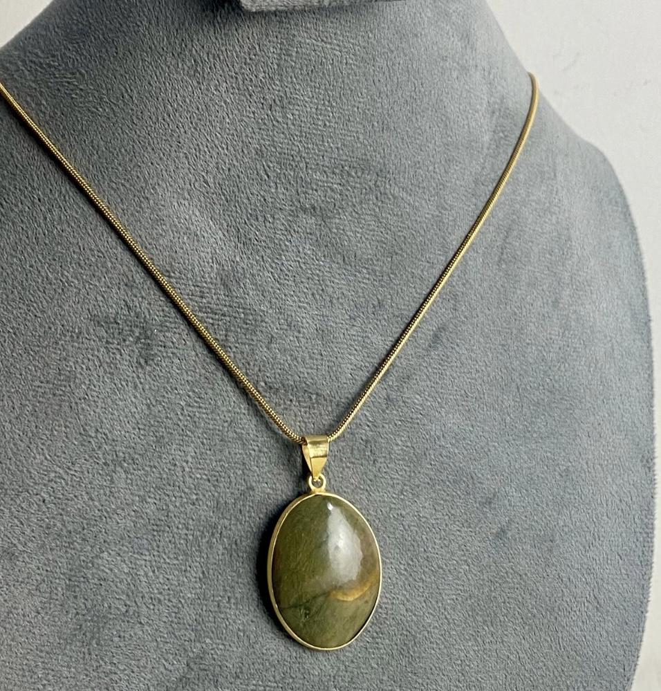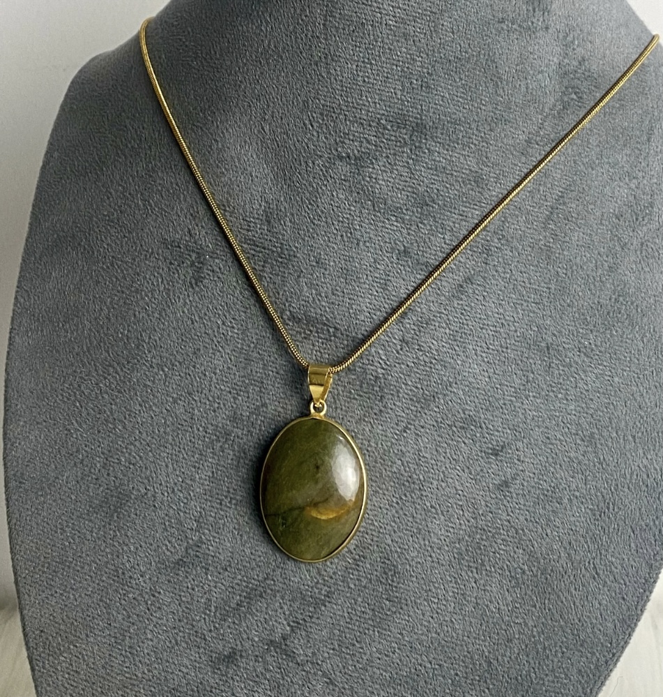 A necklace featuring natural Jade stone with an elegant design that highlights its calm green color. Jade is often associated with luck and balance, and is believed to attract positive energy and promote a sense of calm.
