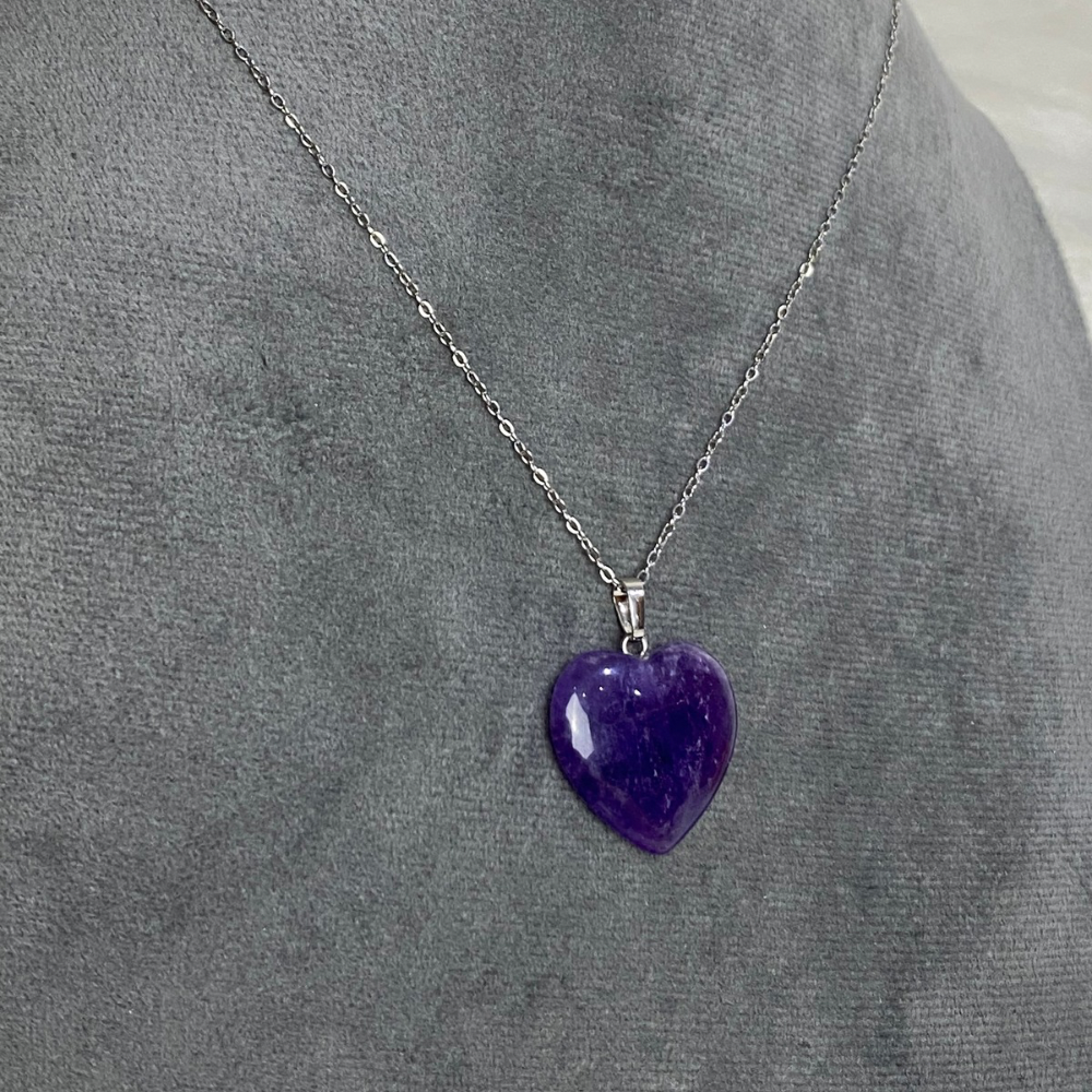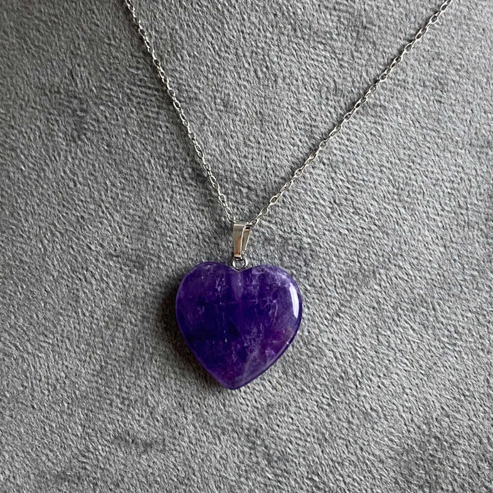 A natural amethyst heart necklace with a calming purple tone that brings a sense of balance and relaxation. paired with a stainless steel chain that is rust-resistant and perfect for everyday wear, finished with a simple and elegant design