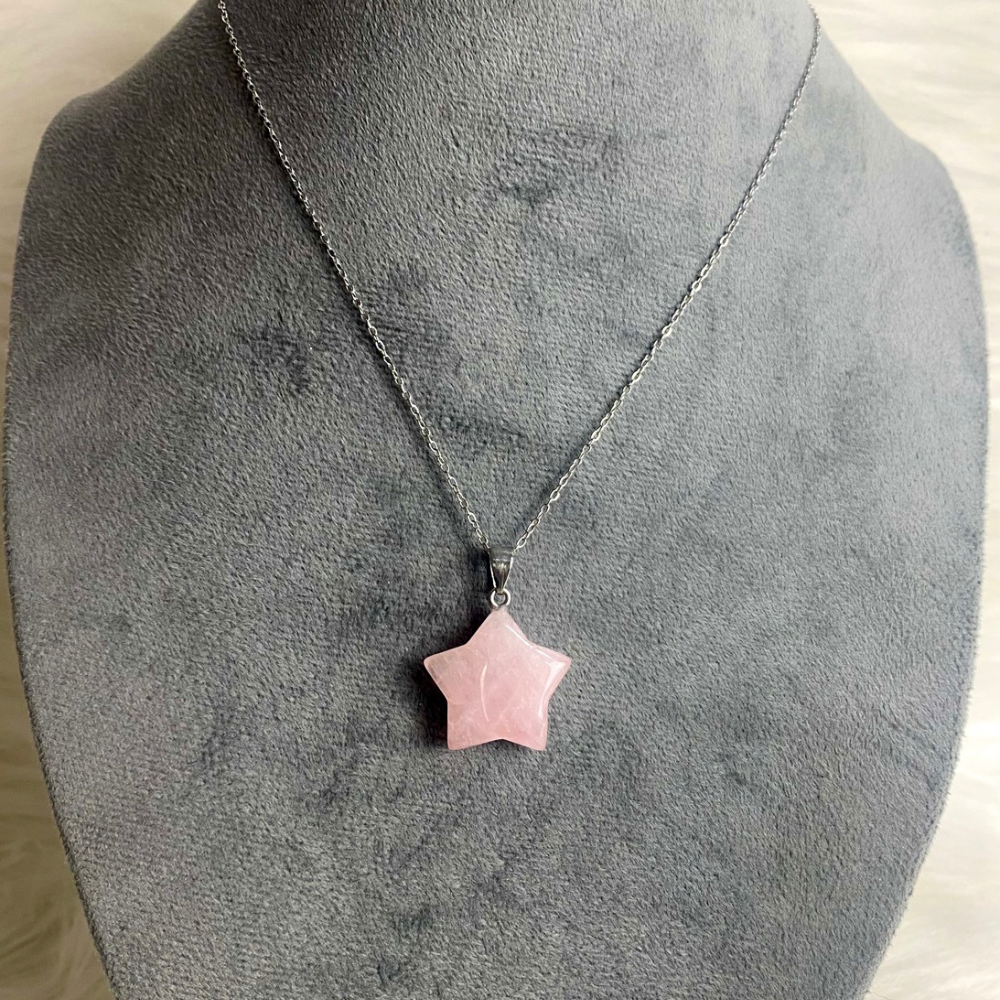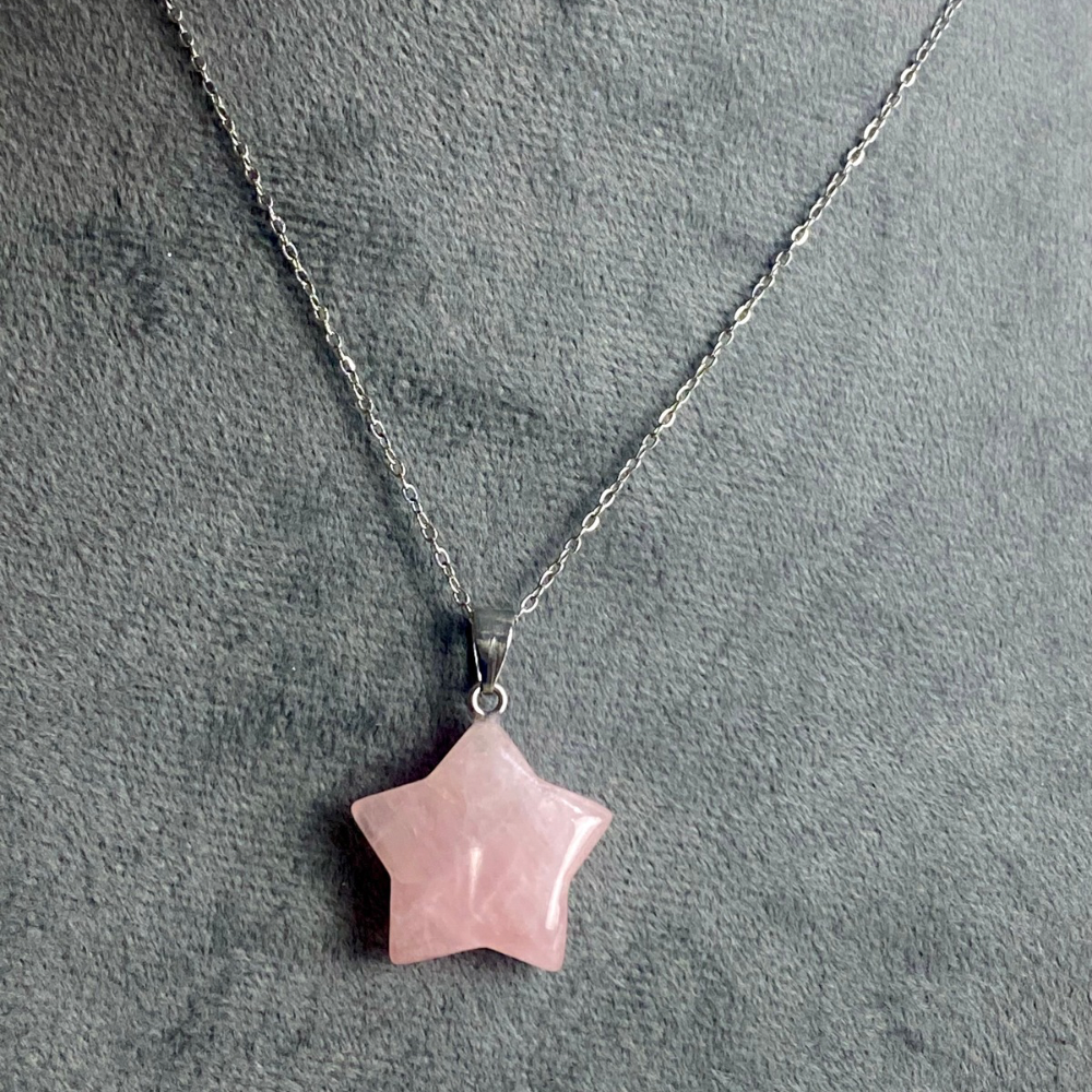 Star-shaped necklace featuring Rose Quartz with a rust-resistant stainless steel chain. Rose Quartz is known for promoting feelings of love, calmness, and emotional balance.