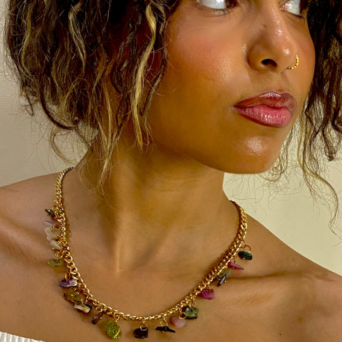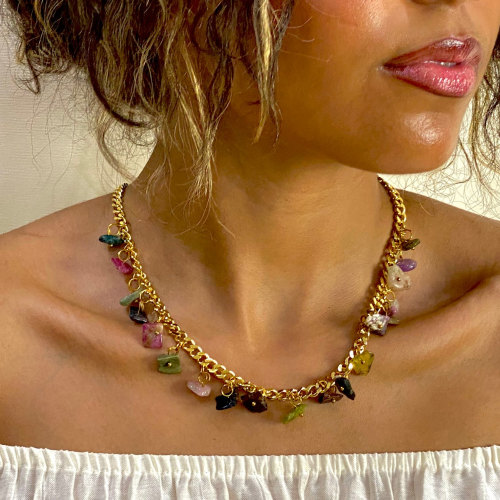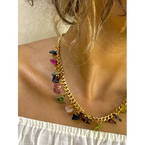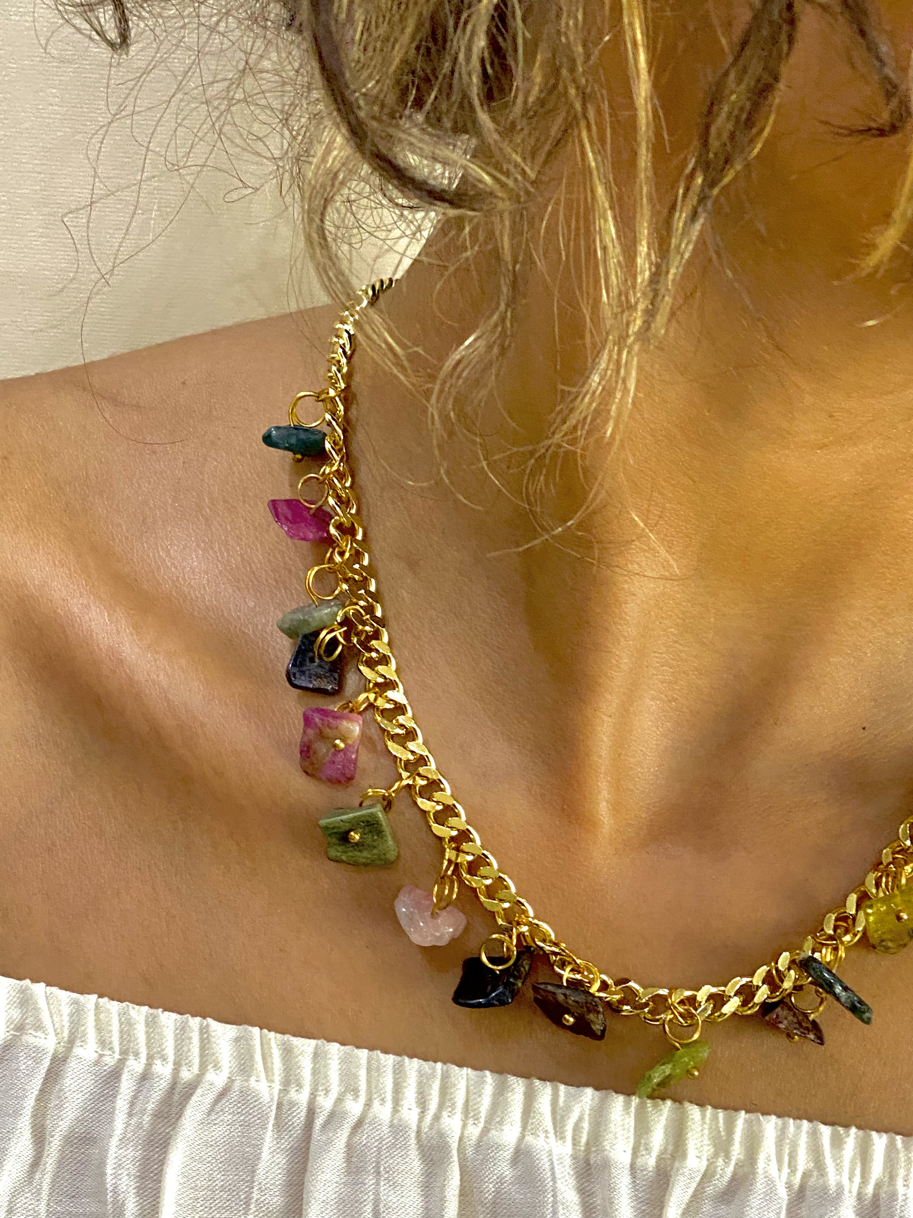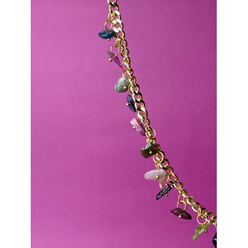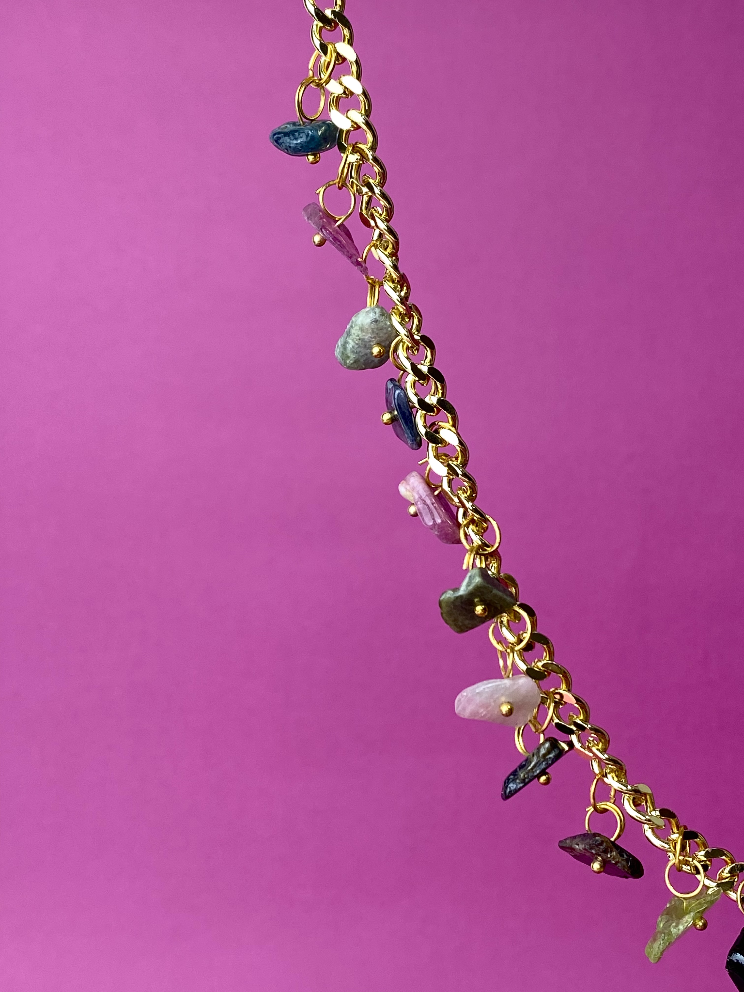 A vibrant mix of treated natural gemstone chips in assorted colors, adding a lively and eye catching touch to any outfit. Set on high-quality gold stainless steel, rust-resistant and designed to retain its shine over time. A unique piece perfect for both everyday wear and special occasions, ensuring you stand out with style.