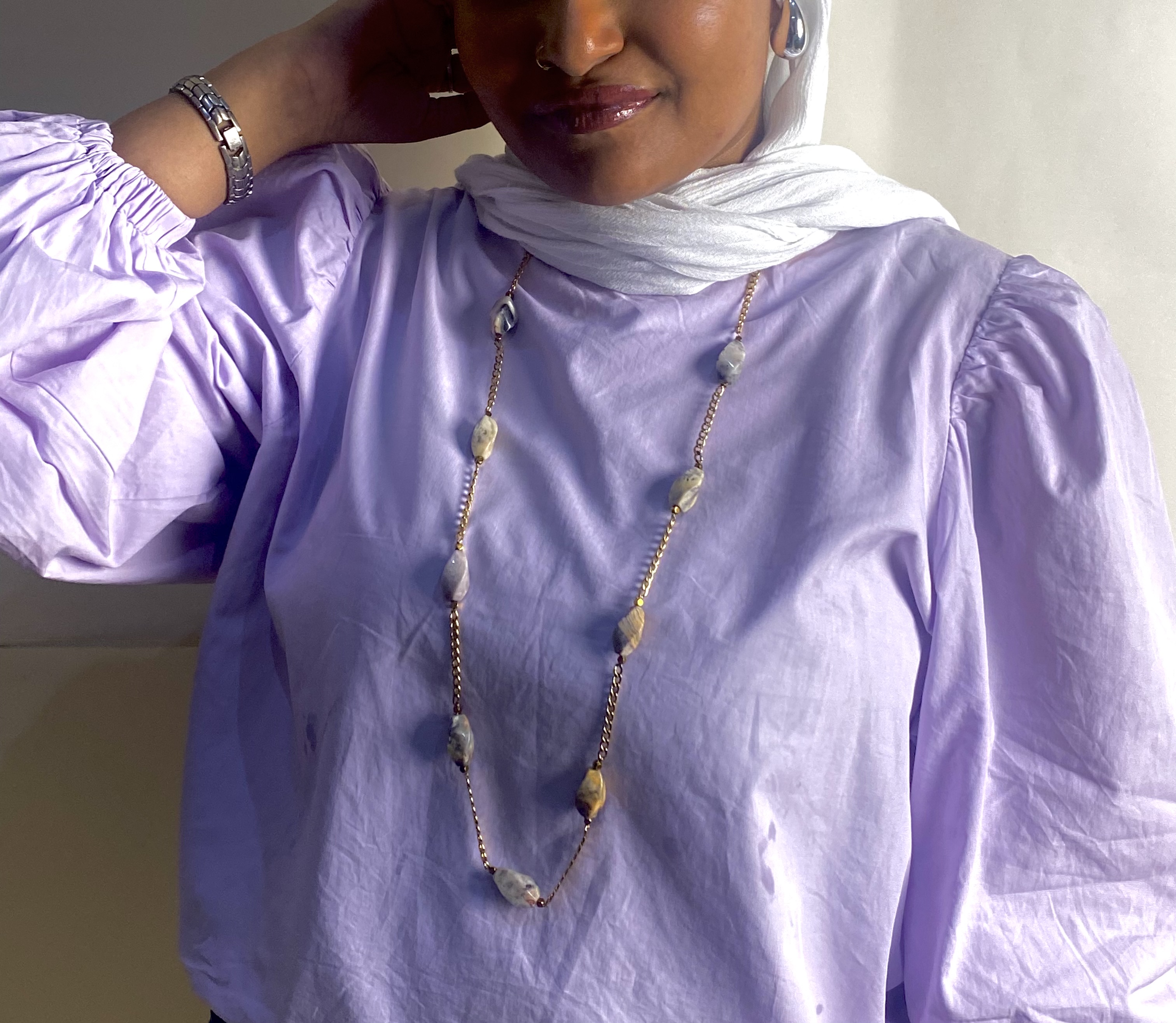 A long necklace made of treated agate stone ????, paired with a gold stainless steel chain that doesn’t rust and keeps its shine. Its simple and elegant design makes it a versatile piece to wear alone or layered for a stylish look.
